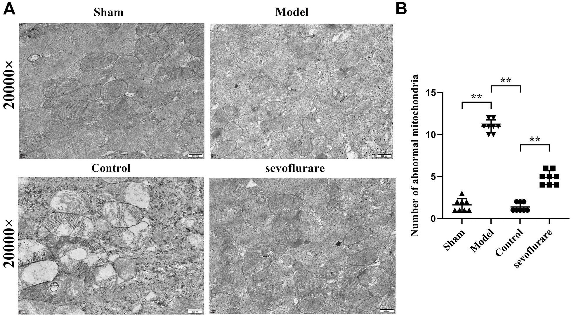 Figure 4. Representative transmission electron microscopic images of mouse lumbosacral spinal cord tissue. (A) Results of transmission electron microscopy, (B) mitochondrial number statistics. Sham group vs. Model group, Model group vs. Sevoflurane group, Control group vs. Sevoflurane group, N=8.