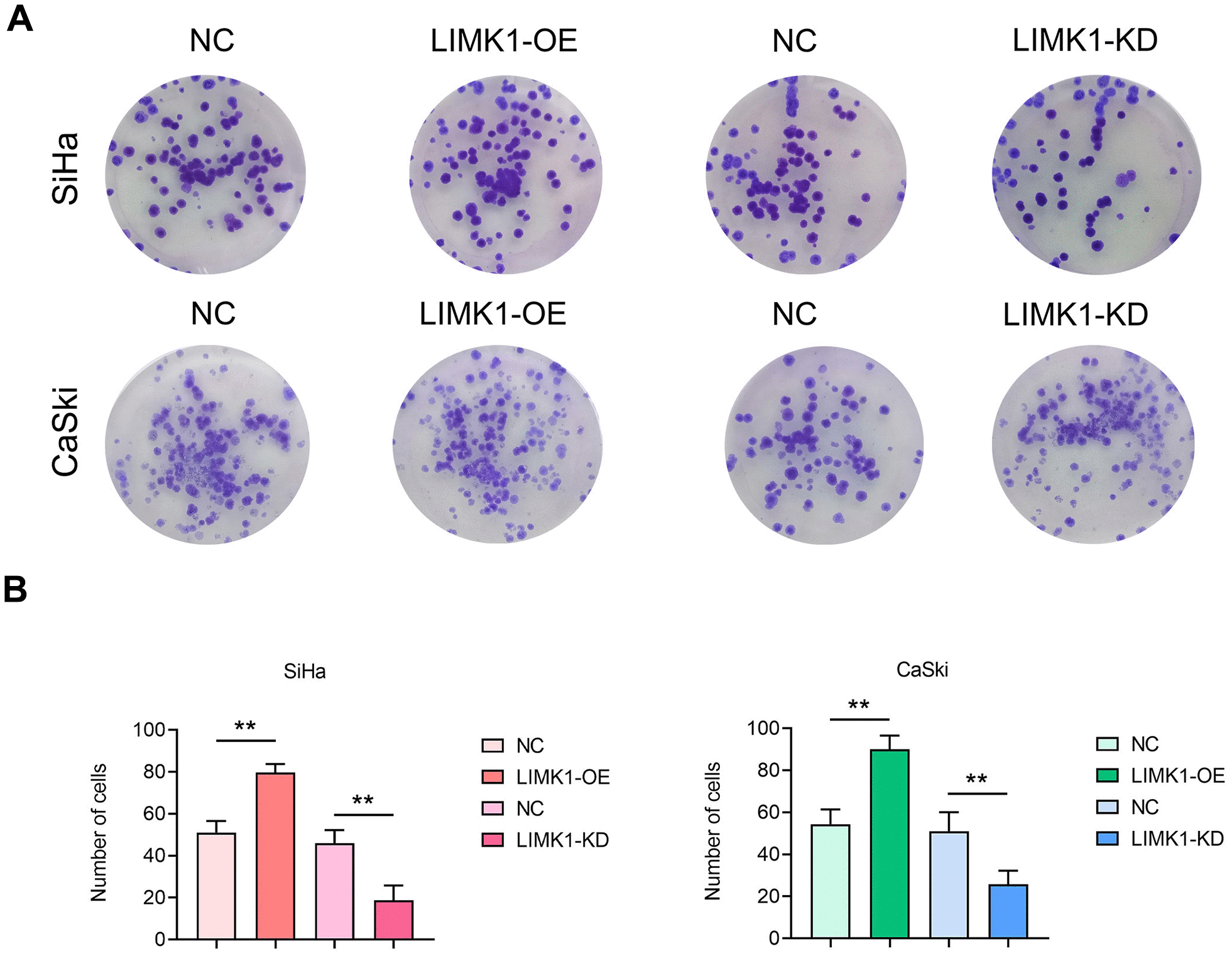 Figure 5. LIMK1 promoted the proliferation of cervical cancer cells. (A) Representative images of SiHa and CaSki cell monoclonal experiments. (B) The results of the clonal formation assay showed that LIMK1 overexpression promoted the formation of cell clones and increased the number of colonies. LIMK1 knockdown inhibited the formation of cell clones, resulting in a decrease in the number of colonies. **P<0.01 indicated statistically significant differences.